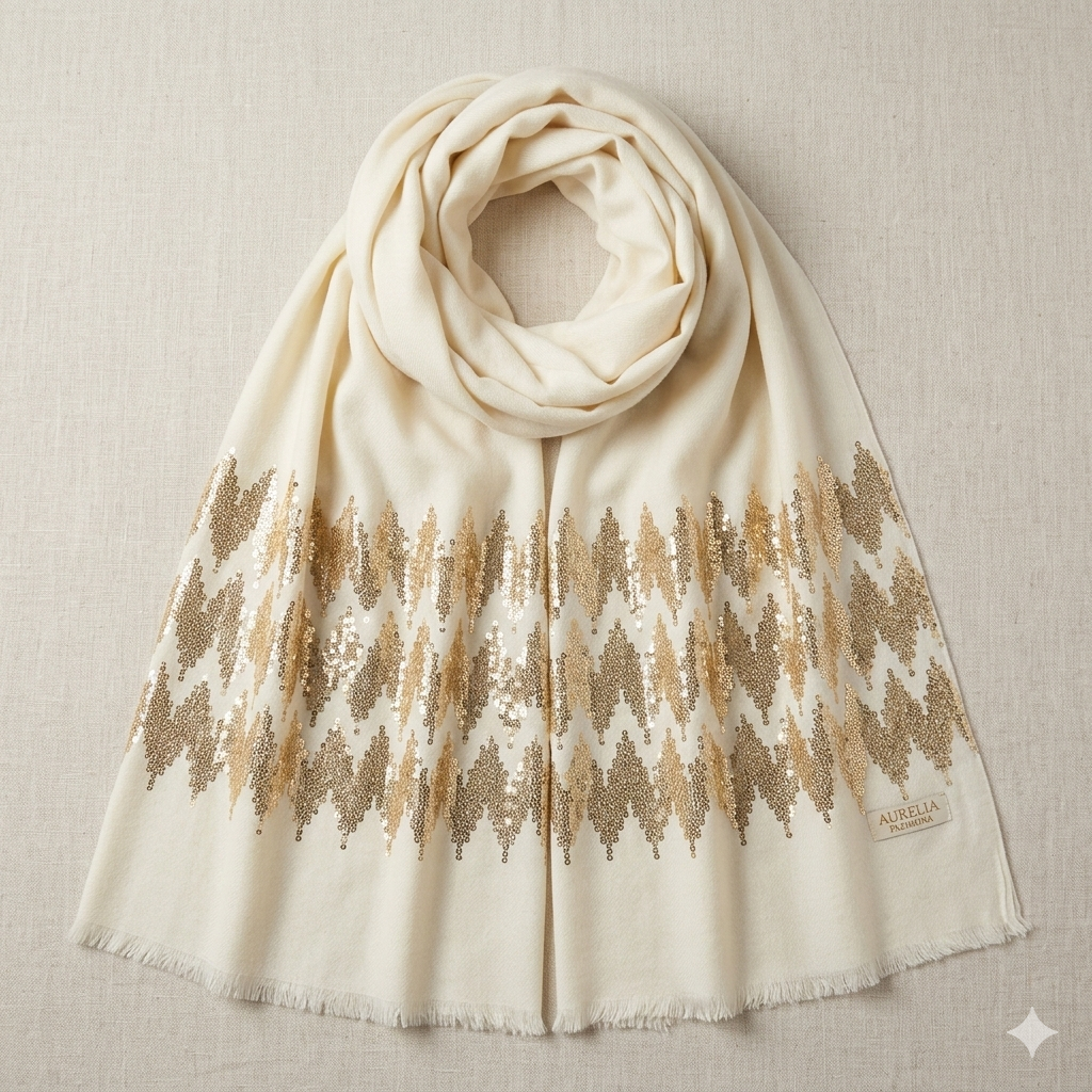 This sophisticated scarf features a cream base adorned with metallic gold zigzag accents, adding a touch of glamour to any outfit. Crafted with attention to detail, it is lightweight, versatile, and perfect for both casual and festive occasions. The Aurelia Woman label ensures quality and timeless style.