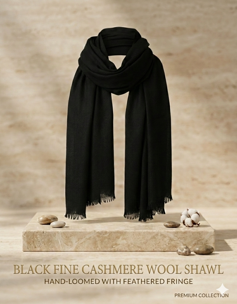 A premium accessory made from fine cashmere wool, hand-loomed for exceptional quality. The deep black tone is timeless, while feathered fringes add a delicate finish. Lightweight yet warm, this shawl is ideal for layering in cooler seasons and elevating evening wear.
